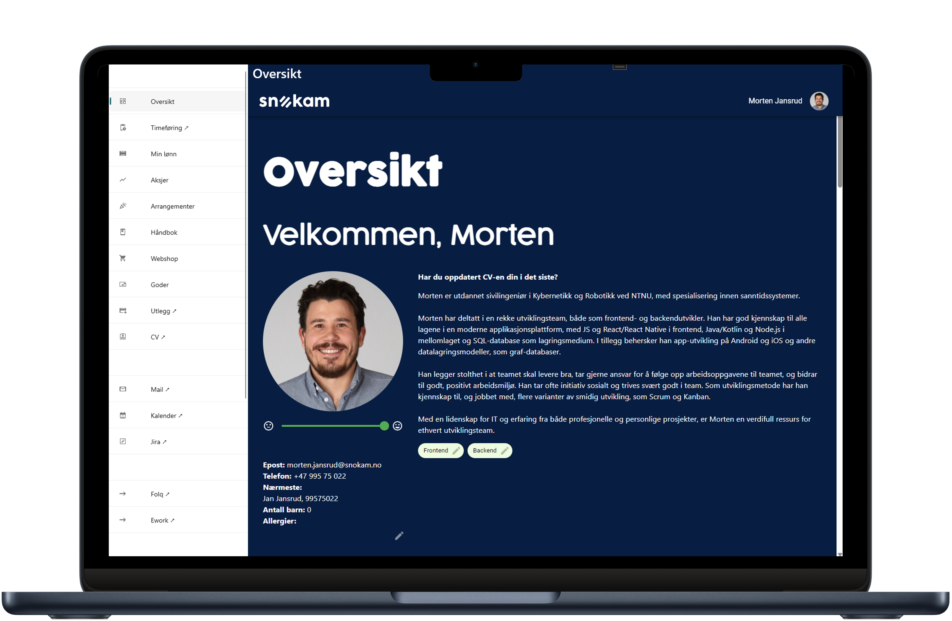 Timeføring, utlegg, sosialt, CV, mail, kalender og andre nyttige tjenester for ansatte i Snøkam